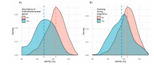 隨后對腸桿菌科內的未知屬進(jìn)行了另外的分析,發(fā)現與母親年齡和吸煙與否幾個(gè)協(xié)變量是相關(guān)的。尤其是和孕婦在懷孕期間吸煙和T4時(shí)期吸煙(圖3B)相關(guān)性更為明顯。中介分析(圖3)表明腸桿菌科中該屬介導了孕婦妊娠期間吸煙和當前吸煙對WPPSI-III FIQ的影響。