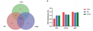 (1)例如,在416個(gè)奶山羊中鑒定得到了7,208個(gè)CNVs,GWAS分析發(fā)現31個(gè)CNVs所在區域與產(chǎn)奶量等性狀顯著(zhù)相關(guān),并且發(fā)現在顯著(zhù)相關(guān)的CNVs中,注釋的基因大多數在產(chǎn)奶相關(guān)的生物過(guò)程和健康相關(guān)性狀中發(fā)揮著(zhù)重要作用。在另一個(gè)研究中,利用新開(kāi)發(fā)的GWAScore方法整合已發(fā)表的GWAS數據來(lái)鑒定潛在的候選位點(diǎn),并對3個(gè)不同品種(CKA,n=10、HU,n=10、STHS,n=9)山羊進(jìn)行全基因組CNVs檢測(圖3),通過(guò)將CNVs與GWAScore和QTL位點(diǎn)相整合,發(fā)現197個(gè)候選基因與CNVs存在重疊,進(jìn)一步鑒定得到28個(gè)與生長(cháng)性狀相關(guān)的CNVs。