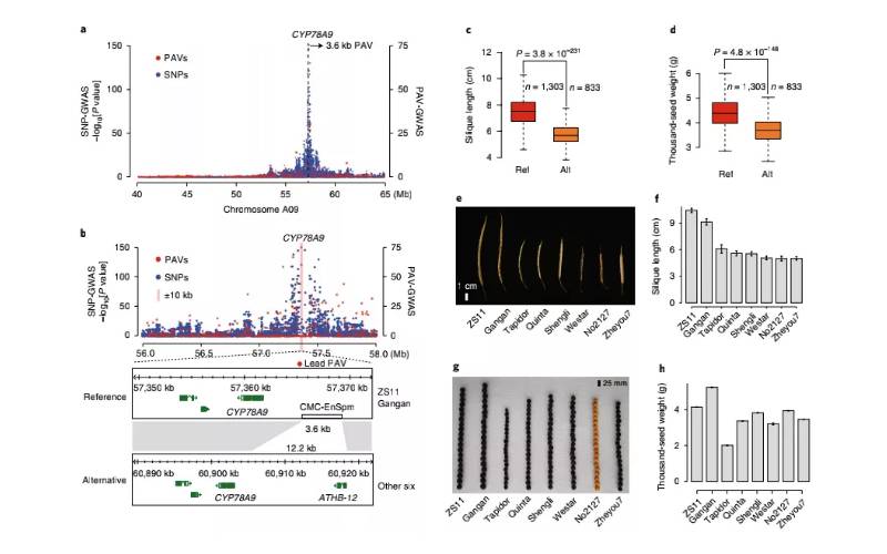 (2)在除水稻以外的作物中也有使用SVs進(jìn)行GWAS的報道。例如,在玉米中,521個(gè)自交系玉米基因組序列中的SVs被用于繪制玉米SV圖譜;在小麥中發(fā)現了影響染色體3B上基因和轉座元件的SV;在最近的一項木瓜研究中(使用栽培木瓜和野生木瓜),共鑒定出8083個(gè)SVs,其中包括5260個(gè)缺失,552個(gè)串聯(lián)重復和2271個(gè)插入,在該研究中,還發(fā)現CNVs與生長(cháng)和對環(huán)境壓力的反應有關(guān);在油菜中,基于鑒定得到的數百萬(wàn)SVs和PAVs用于PAV-GWAS,直接鑒定到了莢果長(cháng)度、種子重量和開(kāi)花時(shí)間相關(guān)的結構變異,這些是之前基于單核苷酸變異SNP進(jìn)行的GWAS所沒(méi)能鑒定出來(lái)的,充分說(shuō)明了PAV-GWAS可以互補于SNP-GWAS用來(lái)鑒定特定性狀相關(guān)的位點(diǎn)(圖7);另外,其他植物SVs鑒定例子包括:溝酸漿屬的耐鹽性、葡萄的漿果顏色和番茄的馴化性狀等研究。
