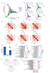 首先基于所有細胞的轉錄組學(xué)特性構建了一個(gè)導向圖(SPRING),所有細胞分為三個(gè)分支:EPI、HYP和TE(圖 2A),明確了嵌合體和對照(人和食蟹猴)胚胎之間基因表達模式的相關(guān)性(圖 2B)。當嵌合人類(lèi)細胞與對照人類(lèi)(0.460)或對照食蟹猴(0.459)細胞進(jìn)行比較時(shí),獲得了類(lèi)似的相關(guān)系數(圖 2B,右圖),但與對照胚胎相比,嵌合猴細胞的相關(guān)系數高于嵌合人類(lèi)細胞(圖 2B,左圖);接下來(lái)發(fā)現嵌合人EPI-like細胞與人胚胎中的EPI細胞相似,而嵌合人HYP和EXMC-like細胞分別與嵌合猴HYP和EXMCs細胞相關(guān)系數最高(圖 2C)。同時(shí)發(fā)現嵌合人類(lèi)EPI-like細胞逐漸傾向于嵌合猴EPI細胞,R2值從0.363(植入前EPI [Pre_EPI])增加到0.464(植入后EPI [PostL_EPI]),再增加到0.693(原腸[Gast]細胞)(圖 2C)。以上結果表明猴胚胎微環(huán)境對人類(lèi)細胞的基因轉錄狀態(tài)產(chǎn)生影響,反之亦然。