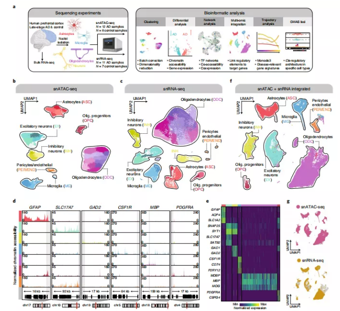 ATAC-seq是檢測組織內開(kāi)放的染色質(zhì)區域。迄今為止,單細胞染色質(zhì)可及性技術(shù),如單核ATAC-seq (snATAC-seq),很少用于疾病組織的原始樣本,因此,研究人員對同一AD患者死后的腦組織樣本同時(shí)進(jìn)行了snATAC-seq和snRNA-seq,以在表觀(guān)基因組和轉錄組水平揭示AD相關(guān)基因調控程序,并為研究大腦的細胞異質(zhì)性提供了一個(gè)新方法,并且能夠揭示特定細胞群中神經(jīng)退化的新途徑。