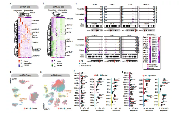 研究者進(jìn)行了snATAC-seq (10×Genomics;12例晚期A(yíng)D、8例對照)和snRNA-seq (10×Genomics v3;11例晚期A(yíng)D、7例對照組),使用從晚期A(yíng)D患者和年齡匹配的認知健康對照組(74-90歲以上;圖1a)。根據Braak分期和斑塊分期定義了晚期A(yíng)D和對照。從同一組織樣本分別生成轉錄組和表觀(guān)遺傳學(xué)數據,以減少兩種方法之間的細胞類(lèi)型組成差異。經(jīng)過(guò)質(zhì)控過(guò)濾后,對130418個(gè)細胞核進(jìn)行snATAC-seq,61472個(gè)細胞核進(jìn)行snRNA-seq。為了保證研究的嚴謹性,對這兩種方法的數據采用了批量校正。對于snATAC-seq,使用了相互最近鄰(MNN)來(lái)校正潛在的semantic indexing來(lái)降低的染色質(zhì)可達性;對于snRNA-seq,使用了整合非負矩陣因子分解(iNMF)來(lái)降維,同時(shí)消除批次效應。將UMAP降維和Leiden聚類(lèi)應用到批量校正的表觀(guān)基因組和轉錄組數據中,在snATAC-seq和snRNA-seq中識別到了不同的細胞類(lèi)型(圖1b、c)。利用snATAC-seq,分析了腦的所有主要細胞類(lèi)型——興奮性神經(jīng)元(24076個(gè)細胞核,EX.a-e)、抑制神經(jīng)元(9644個(gè)細胞核,INH.a-d)、星形膠質(zhì)細胞(15399個(gè)細胞核,ASC.a-f)、小膠質(zhì)細胞(12232個(gè)細胞核,MG.a-e)、少突膠質(zhì)細胞(62253個(gè)細胞核,ODC.a-m)和少突膠質(zhì)細胞前體細胞(4869個(gè)細胞核;OPC.a),基于已知標記基因啟動(dòng)子區域的染色質(zhì)可及性進(jìn)行注釋。同時(shí)使用chromVAR通過(guò)估算可訪(fǎng)問(wèn)染色質(zhì)區域的TF結合基序的富集來(lái)計算單細胞核內TF基序的變異性,并檢測了依據細胞類(lèi)型劃分的TF基序的富集情況,確定了在星形膠質(zhì)細胞、興奮性神經(jīng)元和小膠質(zhì)細胞中隨著(zhù)疾病發(fā)生而富集增加的幾種TF基序。此外,對TF足跡進(jìn)行分析,以進(jìn)一步闡明細胞類(lèi)型特異性TF調控,結果發(fā)現SOX9 TF足跡在少突膠質(zhì)細胞中的作用。研究人員發(fā)現在興奮性神經(jīng)元中TF motif富集了少突細胞相關(guān)的TF。同樣,使用snRNA-seq-檢測到了類(lèi)似的細胞類(lèi)型——興奮性神經(jīng)元(6369個(gè)細胞核,EX1-5)、抑制神經(jīng)元(5962個(gè)細胞核,INH1-4)、星形膠質(zhì)細胞(4756個(gè)細胞核,ASC1-4)、小膠質(zhì)細胞(4126個(gè)細胞核,MG1-3)、少突膠質(zhì)細胞(37052個(gè)細胞核,ODC1-13)和少突膠質(zhì)細胞前體細胞(2740個(gè)細胞核,OPC1-2),通過(guò)細胞類(lèi)型標記基因的表達進(jìn)行分類(lèi)(圖1e)。在這兩種檢測中,少突膠質(zhì)細胞都是常見(jiàn)的細胞類(lèi)型。此外,雖然每種主要細胞類(lèi)型中的許多差異表達基因(DEGs)與以前的文獻一致,但也發(fā)現先前被確定為神經(jīng)元或膠質(zhì)亞型標記的細胞分群特異性基因。