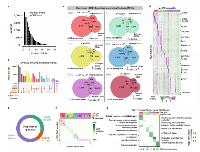 總的來(lái)說(shuō),使用這種方法共鑒定了56552個(gè)gl-cCREs和11440個(gè)cCREs連鎖基因,每個(gè)基因的中位數為4個(gè)cCREs(圖3a)。通過(guò)檢查在每個(gè)細胞類(lèi)型中鑒定的cCREs連鎖基因組之間的重疊,研究人員發(fā)現,除了那些細胞類(lèi)型特異性的基因外,還有大量具有連鎖cCRE的基因在多種細胞類(lèi)型中共享(圖3b)。在一些細胞類(lèi)型中,研究人員發(fā)現cCREs連鎖基因與細胞類(lèi)型標記DEGs以及該細胞類(lèi)型中在A(yíng)D中上調的基因之間存在顯著(zhù)重疊,這表明cCREs在疾病相關(guān)基因表達變化中發(fā)揮關(guān)鍵作用(圖3c)。研究人員還研究了這些gl-cCREs的每個(gè)snATAC-seq分群的染色質(zhì)可及性,并發(fā)現到細胞類(lèi)型和分群高度特異性(圖3d)。大部分gl-cCREs定位于內含子區域(58.35%;圖3e)。此外,通過(guò)檢查NMF系數矩陣(H),研究人員能夠識別每個(gè)NMF模塊對應的分群或細胞類(lèi)型,并注釋了幾個(gè)特定于控制晚期A(yíng)D細胞核的模塊(圖3f、g)。此外,研究人員還發(fā)現一些在多種細胞類(lèi)型中共有的cCRE靶基因在每種細胞類(lèi)型中受不同的cCRE調控。