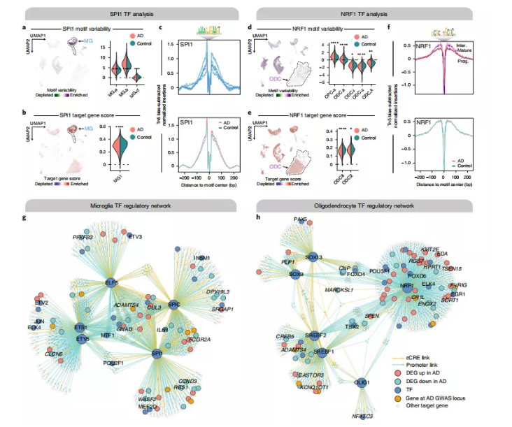 為了進(jìn)一步探究晚期A(yíng)D中TF介導的基因調控,研究人員構建了特定細胞類(lèi)型的TF調控網(wǎng)絡(luò )。對于特定的TF,研究人員確定了候選目標基因,即其啟動(dòng)子或連鎖的cCRE是可訪(fǎng)問(wèn)的,并且在目標細胞類(lèi)型中包含TF的結合基序的基因,研究人員對幾個(gè)選定的TF重復了這一過(guò)程,產(chǎn)生了小膠質(zhì)細胞特異性和少突膠質(zhì)細胞特異性的TF調控網(wǎng)絡(luò )(圖4g,h)。在這些網(wǎng)絡(luò )中,研究人員發(fā)現了多個(gè)AD DEGs,除了位于已知AD GWAS位點(diǎn)的基因外,還受到小膠質(zhì)細胞中的SPI1和少突膠質(zhì)細胞中的NRF1的調控。