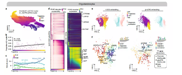 研究人員使用snATAC-seq的58221個(gè)細胞核和snRNA-seq的36773個(gè)細胞核構建了一個(gè)完整的少突膠質(zhì)細胞軌跡(圖5a),發(fā)現AD晚期樣本的細胞核比例似乎沿著(zhù)軌跡增加(圖5b)。為了闡明與晚期A(yíng)D相關(guān)的少突膠質(zhì)細胞的功能狀態(tài),研究人員檢測了新形成的少突膠質(zhì)細胞(NF-ODCs)、髓鞘形成的少突膠質(zhì)細胞(MF-ODCs)和成熟的少突膠質(zhì)細胞(圖5c)。研究人員發(fā)現成熟ODC基因表達特征在軌跡的末端增加,而MF-ODC基因表達特征減少。此外,NF-ODC基因標記在整個(gè)軌跡中全部降低,這表明少突膠質(zhì)細胞偽時(shí)間軌跡再現了少突膠質(zhì)細胞成熟過(guò)程。9231個(gè)少突膠質(zhì)細胞gl-cCREs的染色質(zhì)可及性和1563個(gè)用RVAE重建的少突膠質(zhì)細胞t-DEGs的基因表達表明,大量的染色質(zhì)重塑和轉錄重編程可能是少突膠質(zhì)細胞成熟的基礎(圖5d)。