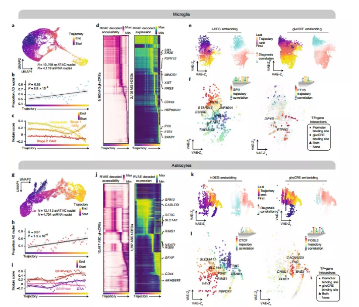 為了進(jìn)一步揭示阿爾茨海默癥膠質(zhì)細胞異質(zhì)性的分子機制,研究人員使用Monocle3進(jìn)行了偽時(shí)間軌跡分析。在少突膠質(zhì)細胞、小膠質(zhì)細胞和星形膠質(zhì)細胞中整合的snATAC-seq和snRNA-seq數據。多組軌跡分析能夠研究在細胞狀態(tài)轉換的連續體中基因表達、染色質(zhì)可及性和TF基序可變性的動(dòng)態(tài)。研究人員使用遞歸變異自動(dòng)編碼器(RVAE)對基因表達和染色質(zhì)可及性動(dòng)態(tài)進(jìn)行建模。對于每種細胞類(lèi)型,研究人員確定了沿著(zhù)軌跡差異表達的基因(t-DEGs)。