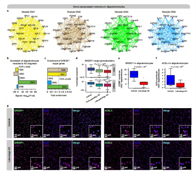 此外,研究人員在共表達網(wǎng)絡(luò )中檢查了SREBF1的下游調控靶基因。隨后又發(fā)現其中三個(gè)少突膠質(zhì)細胞顯著(zhù)富集了SREBF1的靶基因,這表明SREBF1在調節這些模塊中的基因表達方面發(fā)揮重要作用(圖8c)。將批量RNA-seq、高通量蛋白質(zhì)組學(xué)、SREBF1-ChIP)以及ChIP-seq的數據確定了SREBF1靶基因的蛋白-蛋白相互作用(PPI)網(wǎng)絡(luò )。此外,研究人員發(fā)現SREBF1靶基因模塊的基因表達量在A(yíng)D早期和晚期樣本的蛋白和RNA中下調(圖8d),證實(shí)snATAC-seq SREBF1基序的可變性。通過(guò)RNA原位雜交和免疫組織化學(xué)方法驗證了SREBF1在晚期A(yíng)D中的下調,并發(fā)現ACSL4的表達在晚期A(yíng)D中有所降低,ACSL4是ENCODE Chip-Seq數據中發(fā)現的SREBF1的靶點(diǎn)之一 (圖8e-g)??傮w而言,研究人員的共表達網(wǎng)絡(luò )分析方法有助于識別細胞類(lèi)型特異性疾病,在少突膠質(zhì)細胞中發(fā)現了TF SREBF1,這在A(yíng)D中基本上沒(méi)有研究過(guò),表明其研究方法能夠對疾病產(chǎn)生新的見(jiàn)解。