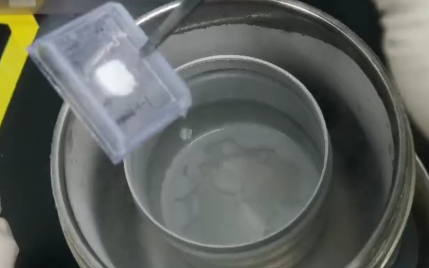 在無(wú)菌超凈臺中,用異戊烷(足以完全浸沒(méi)組織包埋盒)填充三分之二的金屬燒杯,然后放入液氮杜瓦瓶中(液氮與異戊烷保持相同的水平面)以充分接觸,孵育 5-10 分鐘,時(shí)間不宜太久,防止異戊烷凝結。