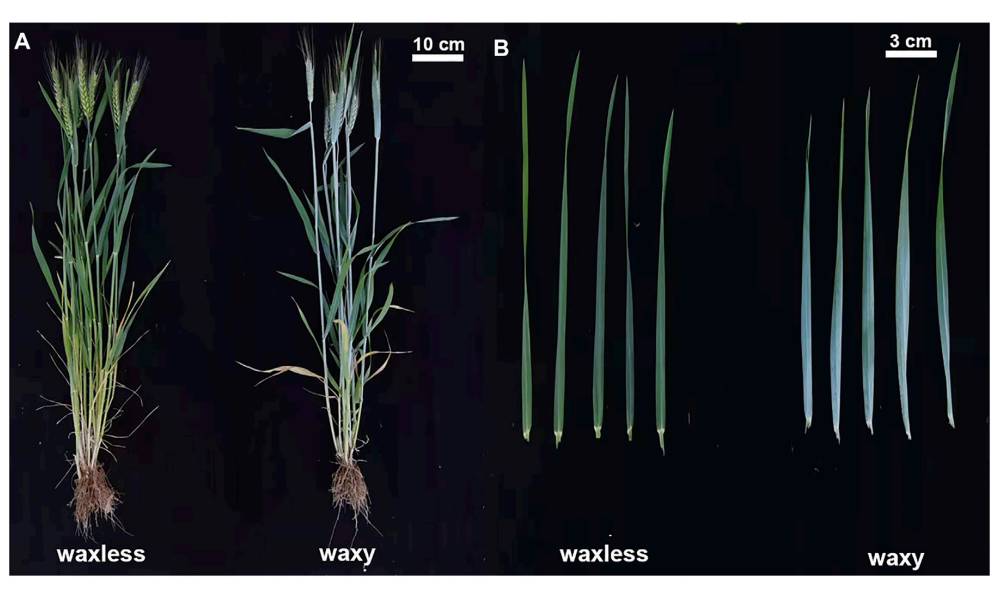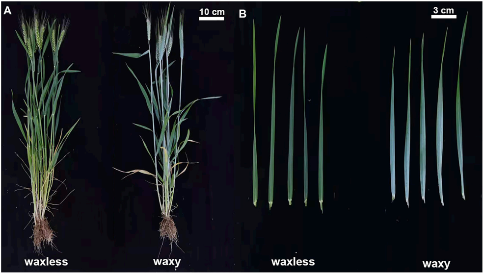 材料:EMS誘變22號高產(chǎn)品種冀麥,分離出蠟質(zhì)(waxy)和無(wú)蠟質(zhì)突變體(waxyless),種植至抽穗期取葉片組織。