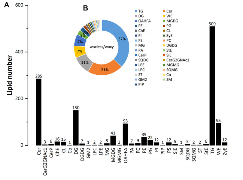 1. 本研究對冀麥22號低蠟突變體和多蠟突變體的葉表皮蠟進(jìn)行了非靶向脂質(zhì)體檢測和轉錄組分析。共鑒定出31個(gè)脂類(lèi)亞類(lèi)和1,367個(gè)脂類(lèi)分子。