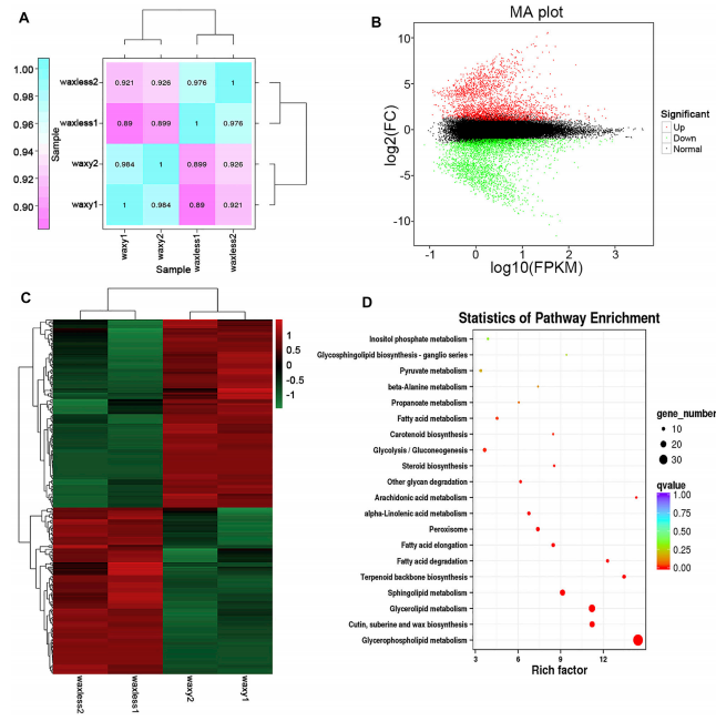 此外,我們注釋了3659個(gè)DGE的脂質(zhì)功能,篩選了343個(gè)DGE,并使用KEGG富集分析對其進(jìn)行富集(圖2C,D)。研究發(fā)現,這些基因主要集中在甘油磷脂代謝、角質(zhì)層、亞油酸和蠟的生物合成、甘油脂代謝、鞘脂代謝、萜類(lèi)主干生物合成、脂肪酸降解和脂肪酸伸長(cháng)途徑中,這與該研究中控制小麥葉片光澤表型的主要脂質(zhì)組分一致。