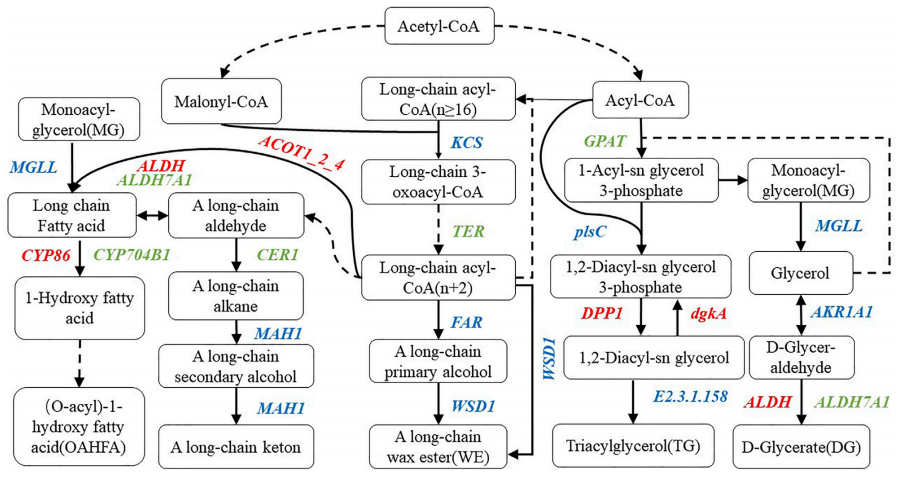 在OAHFA合成過(guò)程中,?;o酶A硫代酯酶1/2/4基因(ACOT1_2_4)的上調表達促進(jìn)長(cháng)鏈脂肪酸的合成,而?;视椭久富颍∕GLL)的表達水平在單?;视娃D化為長(cháng)鏈脂肪酸的過(guò)程中上調和下調。醛脫氫酶家族7個(gè)成員A1基因(ALDH7A1)表達下調抑制了A長(cháng)鏈醛與長(cháng)鏈脂肪酸之間的過(guò)渡,醛脫氫酶基因(ALDH)則上調了A長(cháng)鏈醛與長(cháng)鏈脂肪酸之間的過(guò)渡。在長(cháng)鏈脂肪酸轉化為ω-羥基脂肪酸的過(guò)程中,長(cháng)鏈脂肪酸ω-單加氧酶基因(CYP704B1)的表達下調,而突變無(wú)蠟脂肪酸ω-羥化酶基因(CYP86)的表達上調。甘油-3磷酸?;D移酶基因(GPAT)和ALDH7A1在DG、MG和TG的甘油酯代謝過(guò)程中下調。在無(wú)蠟情況下,葡萄糖的表達下調抑制了1-?;?sn甘油3-磷酸的合成,從而減少了鎂的合成。ALDH7A1在低蠟突變體中的下調表達降低了DG的合成。上調基因為ALDH、二酰甘油二磷酸磷酸酶基因(DPP1)和二酰甘油激酶基因(dgkA),而1-?;?SN-甘油-3-磷酸?;D移酶基因(plsC)的表達為磷脂:酰甘油?;D移酶基因(E2.3.1.158)、MGLL和酒精脫氫酶基因(AKR1AI)均上調和下調。這些基因共同作用降低低蠟突變無(wú)蠟細胞中TG的含量。