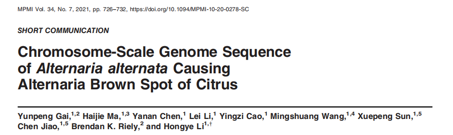 1.Gai Y, Ma H, Chen Y, et al. Chromosome-scale genome sequence of Alternaria alternata causing Alternaria brown spot of citrus[J]. Molecular Plant-Microbe Interactions, 2021 (ja).
