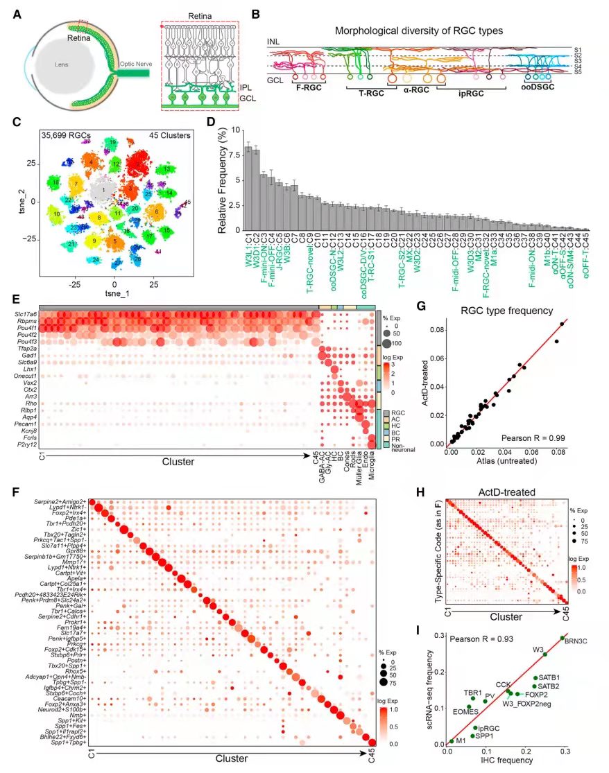 圖1 scRNA-seq揭示成年小鼠45種不同的RGC類(lèi)型