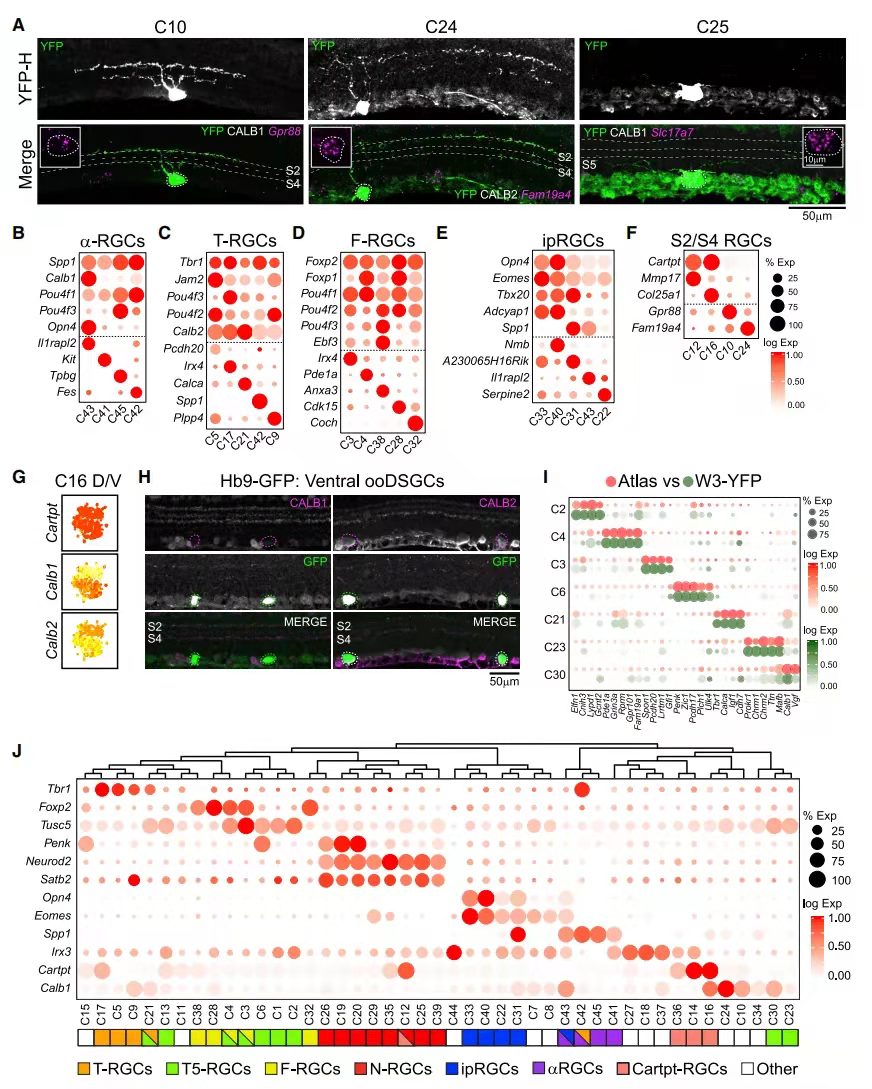 通過(guò)scRNA-seq和形態(tài)學(xué)對視網(wǎng)膜進(jìn)行雙重驗證。結果發(fā)現aRGC為C41-43、45這4個(gè)cluster(圖 2B);之前的研究?jì)H確定了4個(gè)T-RGC和4個(gè)F-RGC類(lèi)型,但單細胞揭示了每個(gè)亞類(lèi)中的第5種類(lèi)型(分別為C9和C32;圖 2C和2D);同時(shí)ipRGC也發(fā)現了M1(C33和40)、M2(C31)和 M4(C43)類(lèi)型的標記(圖 2E);ooDSGC中大部分是Cartpt+,通過(guò)Mmp17的表達確定了N-ooDSGC;C16表達的Col25a1,是D-和V-ooDSGC的marker。最后CALB1+細胞是D-ooDSGCs ,CALB2高表達細胞是V-ooDSGC(圖 2F-2H)。已知RGC子類(lèi)與cluster存在部分重合,每種cluster不超過(guò)兩個(gè)子類(lèi)。子類(lèi)與cluster重合表達的基因如圖2J,如:4/5 T-RGCs (Tbr1+)、4/5 F-RGCs (Foxp2+)、5/9 T5-RGCs (Tusc5+)、4/5 ipRGCs(Opn4+)和3/4 aRGC(Spp1+)。另外還鑒定到了新的子類(lèi):如8個(gè)表達轉錄因子Neurod2和Satb2的cluster被化為N-RGC等。其余11/45類(lèi)型未分配到子類(lèi),但它們確實(shí)表現出與其他類(lèi)型的相關(guān)性。