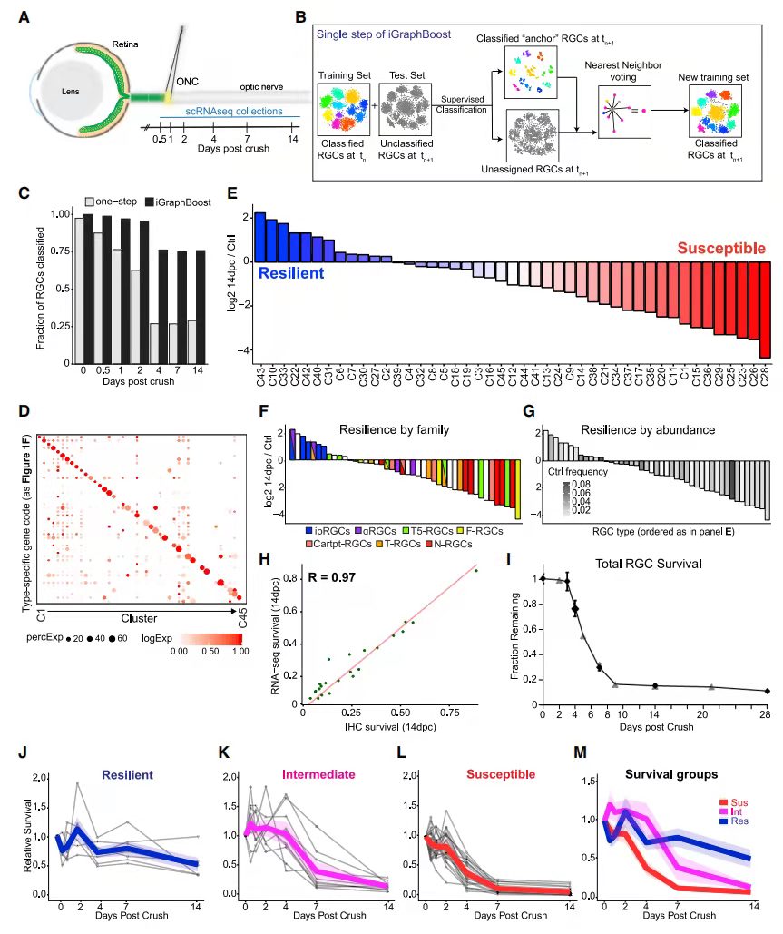 以RGC圖譜為基礎,評估了不同細胞類(lèi)型對ONC的彈性(圖 3A)。在ONC后14天對~8,500個(gè)RGC進(jìn)行分析,此時(shí)~80% RGC已經(jīng)死亡(圖 3C),該研究使用iGraphBoost對細胞進(jìn)行分群(圖 3B),iGraphBoost可以將89%損傷的RGC分配到各個(gè)cluster中(圖 3C)。損傷后第14天所有cluster表達的marker基因同1F(圖3D)。與對照相比,將14dpc不同RGC類(lèi)型的存活率按從高到低排列(圖 3E),不同RGC類(lèi)型在14dpc時(shí)表現出不同的存活率,范圍從1%到98%不等。比較轉錄組測序和IHC對細胞活率的結果,結果高度一致(Pearson r = 0.97)(圖 3H)。這些數據表明不同RGC對傷害的不同反應。所有ipRGC(Opn4+)都是有彈性的,所有N-RGC類(lèi)型都是易受影響的(圖 3F)。之前被定性為彈性子類(lèi)的aRGC中,C42,43具有很高的彈性,但C41,45相對容易受到影響(圖 3F)。同樣,稀有和豐富的類(lèi)型都可能具有彈性或脆弱性(圖 3G)。因此,基因表達或RGC子類(lèi)都不是判斷細胞是否是彈性的完美因子。