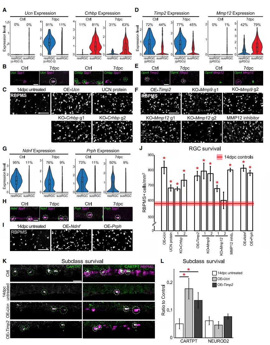 尿皮質(zhì)素(Ucn),它編碼來(lái)自促腎上腺皮質(zhì)激素釋放因子家族的肽;促腎上腺皮質(zhì)激素釋放激素結合蛋白(Crhbp)。ONC后Ucn僅在aRGC中上調,而Crhbp在ONC前后susRGC中表達(圖 5A和5B)。過(guò)表達Ucn,注射Ucn重組蛋白,通過(guò)CRISPR和兩種不同的sgRNA敲除Crhbp,結果發(fā)現四種方式都顯著(zhù)增加RGC的存活率(圖 5C和5J)。隨后又驗證了幾對基因的表達和功能富集情況,結果與Ucn和Crhbp類(lèi)似。說(shuō)明可以通過(guò)對基因的干預來(lái)保護部分脆弱的RGC類(lèi)型。