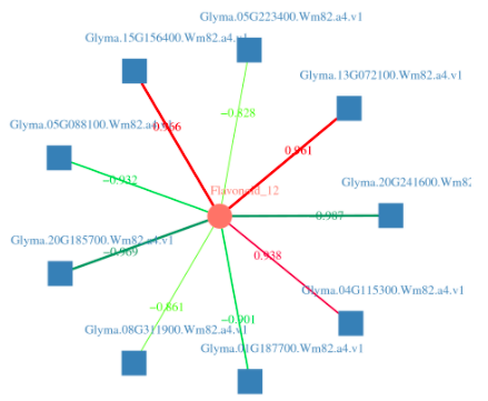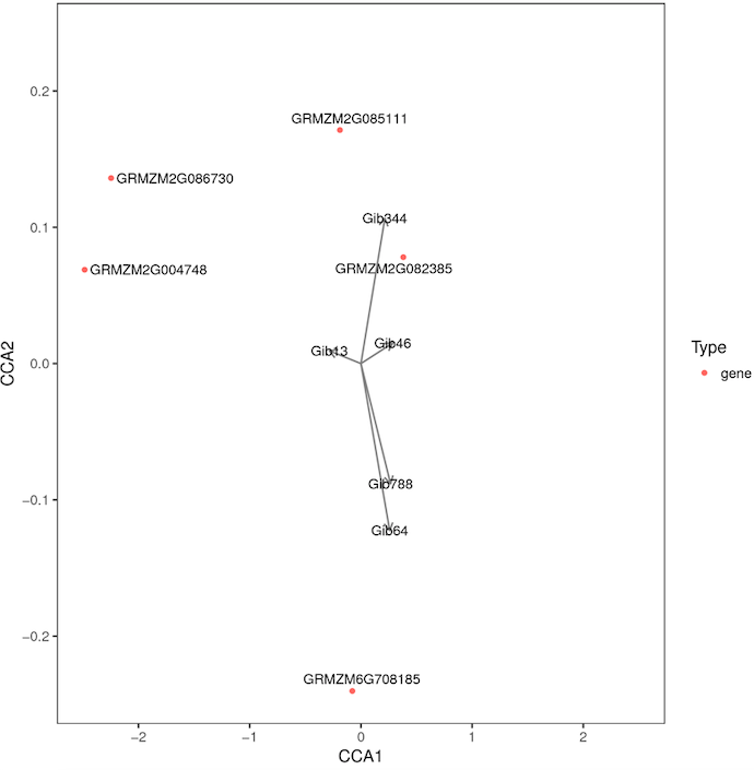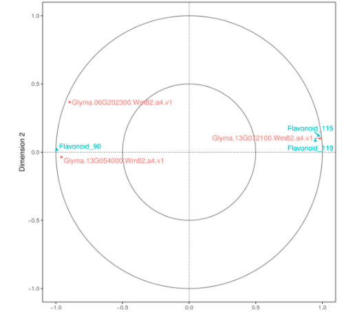典型相關(guān)分析(canonical correlation analysis, CCA),是利用綜合變量對之間的相關(guān)關(guān)系來(lái)反映兩組指標之間的整體相關(guān)性的多元統計分析方法。對相關(guān)性網(wǎng)絡(luò )圖中的差異基因及差異代謝物進(jìn)行典型相關(guān)分析,圖中以十字區分出四個(gè)區域,在同一個(gè)區域內,距原點(diǎn)越遠關(guān)聯(lián)性越高,在同一個(gè)象限內距離較近的代謝物和基因之間相關(guān)聯(lián)的程度高,基于此結果可進(jìn)一步挖掘和代謝物最相關(guān)的基因。