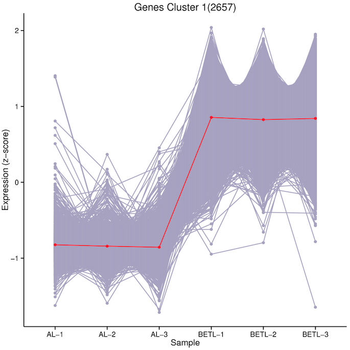將各個(gè)分組對差異代謝物和差異基因分別用Kmeans進(jìn)行分類(lèi),然后按分類(lèi)進(jìn)行繪圖,可找到變化趨勢一致代謝物和基因,這些趨勢一致代謝物和基因之間可能存在一定的關(guān)系,為研究提供了一定的方向。