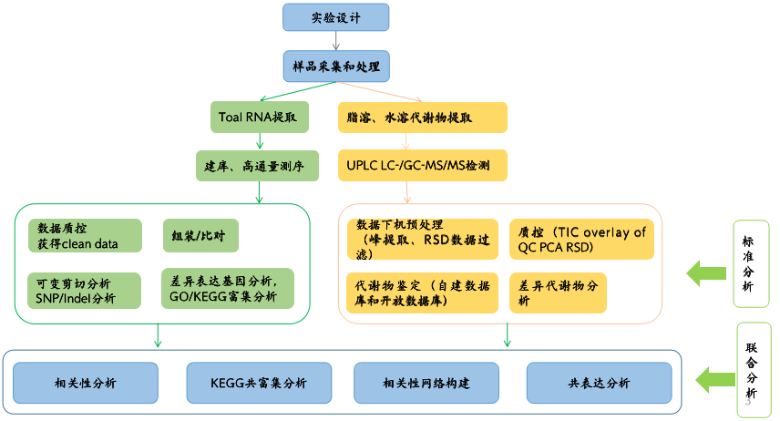 代謝與轉錄組聯(lián)合分析是基于兩個(gè)組學(xué)各自的標準分析結果,將差異代謝物和差異基因在代謝通路上的注釋結果進(jìn)行關(guān)聯(lián)分析,可以在代謝通路上更好地解釋轉錄調控機制。常規的聯(lián)合分析內容主要包括代謝組和轉錄組KEGG通路分析、KEGG共富集分析、相關(guān)性分析、差異基因和差異代謝物趨勢分析、典型相關(guān)性分析、限制性對應分析等內容。