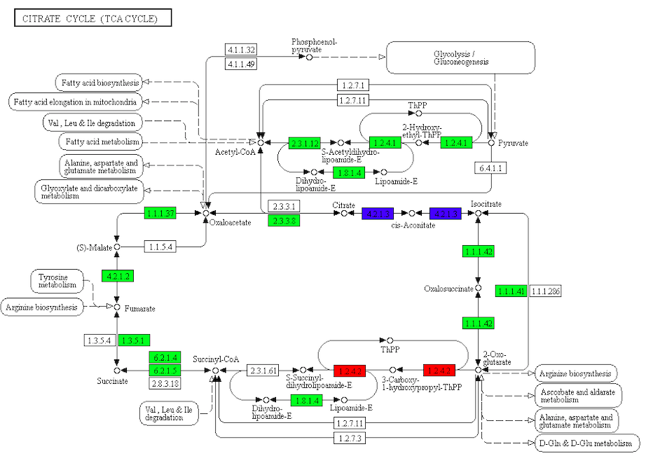 差異代謝物分析結果結合轉錄組差異基因分析結果,將相同分組的差異基因及差異代謝物同時(shí)映射到KEGG通路圖上,用綠色和紅色標注基因或代謝物表達量顯著(zhù)下調或上調的節點(diǎn),藍色標注既有上調又有下調的基因,更好的了解基因與代謝物之間的關(guān)系。