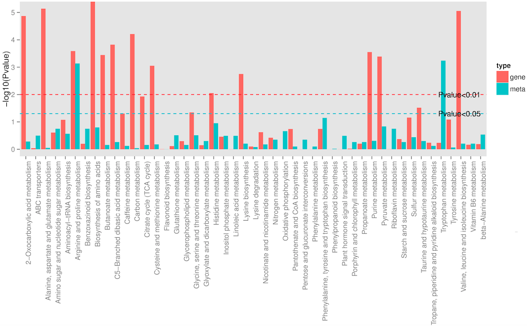 進(jìn)行KEGG注釋時(shí),差異代謝物與差異基因同時(shí)注釋的通路往往有很多。這種情況下,挑選基因和代謝的通路富集系數pvalue<0.05優(yōu)先進(jìn)行分析,這樣可以節約篩選數據的時(shí)間,快速找到與研究目的相關(guān)的通路進(jìn)行后續分析。