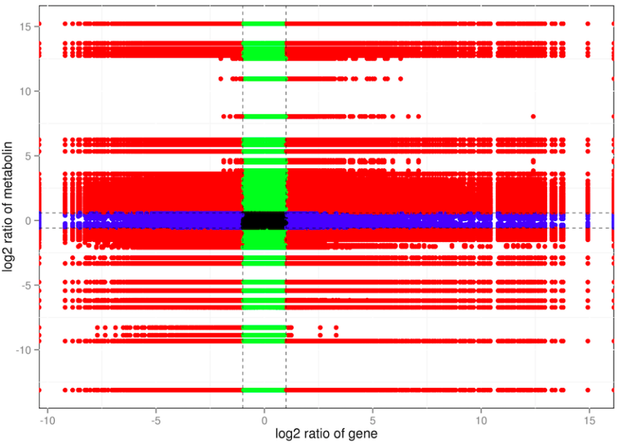 將不同差異分組基于皮爾遜相關(guān)性(pearson)方法計算所有基因和代謝物之間的相關(guān)性,然后按照相關(guān)性系數(Correlation Coefficient,CC)和相關(guān)性的pvalue篩選表達相關(guān)性較高的基因和代謝物。并利用九象限圖對于篩選后的基因和代謝物的表達趨勢進(jìn)行分析,例如基因和代謝物表達趨勢一致或相反,表明基因可能是正向或者負向調控代謝物,或者基因/代謝物表達發(fā)生變化,但是對應的代謝物/基因表達不變,則說(shuō)明還有其他的調控機制參與到整個(gè)代謝通路中。