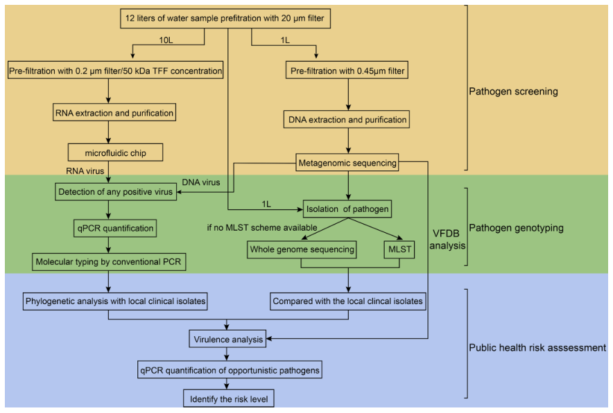 水生病原體可引起嚴重疾病,如霍亂、鉤端螺旋體病、傷寒或腹瀉。鑒于這些新出現的疾病的不可預測性和高度多樣性,水傳播病原體監測的關(guān)鍵挑戰之一是優(yōu)先為局部暴發(fā)做好準備。為應對這些挑戰,該研究分三個(gè)步驟進(jìn)行公共衛生風(fēng)險評估:潛在病原體篩選、病原基因型確認、與當地臨床資料比較。
