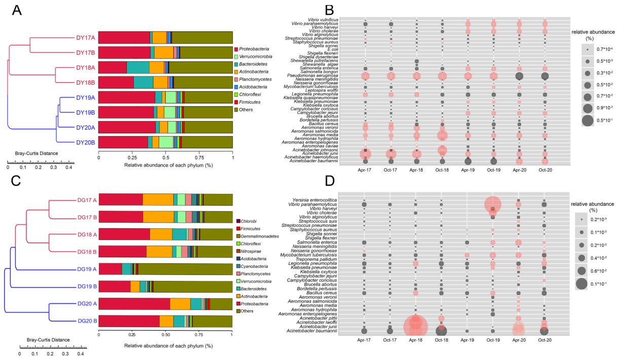 A:DY細菌群落相對豐度;B:DG中細菌群落相對豐度;C:DY樣品中細菌病原體的動(dòng)態(tài);D:DG樣品中細菌病原體的動(dòng)態(tài)