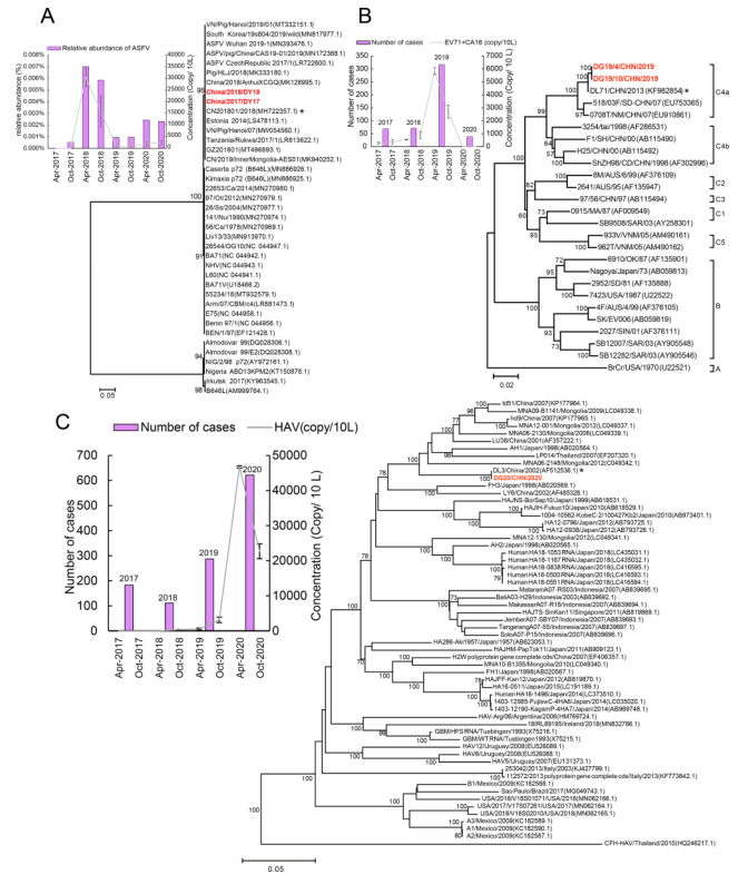 在DY發(fā)現了非洲豬瘟病毒(ASFV)和豬痘病毒(Swinpox Virus)等幾種病毒。ASFV在2017年10月被檢測到,并在2018年達到頂峰(圖6A),并通過(guò)qPCR證實(shí)。qPCR在2018年4月后連續檢測到ASFV,其中2018年4月的病毒載量為3.0×103拷貝/L。在DG地點(diǎn)未檢測到ASFV和Swinpox病毒,在兩個(gè)地點(diǎn)均未檢測到其它人畜共患病DNA病毒。通過(guò)高通量微流控芯片檢測檢測了40種致病性RNA病毒的存在。DY樣品中,經(jīng)qPCR確認,2019年僅檢測到諾如病毒、流行性腮腺炎病毒、鼻病毒和Human herpesvirus 6病毒。DG樣品中,2017年至2019年在樣本中檢測到human enterovirus 71 (EV71),2020年4月檢測到Coxsackievirus 16 (CA16)。