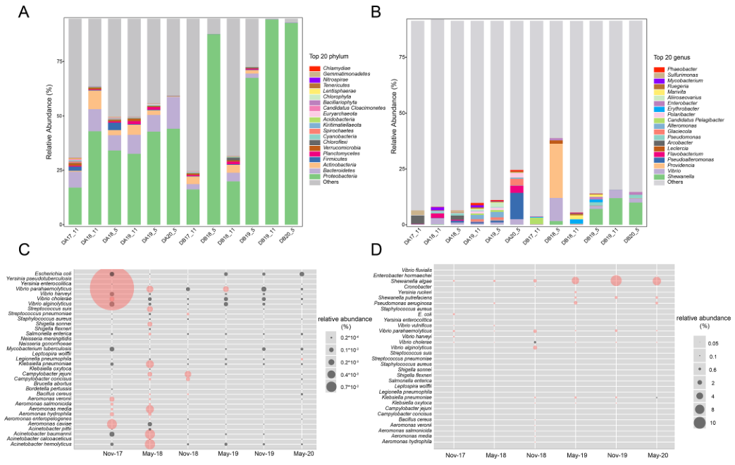 宏基因組數據中大約90%的reads與細菌相對應。DA樣品中,變形菌門(mén)數量最多,其次是疣微菌門(mén)和放線(xiàn)菌(分別為35%和58%)(圖4A)。DB樣品中,變形菌門(mén)從2017年的50.1%增加到2020年的84.7%(圖4A)。兩個(gè)地點(diǎn)的微生物組成自2018年11月后出現了差異。在每個(gè)采樣時(shí)間,豐度 top20屬代表了微生物群落的35%到57%(圖5B)。在2019年(5.8%)和2020年(4.8%)采集的樣品中發(fā)現了弧菌屬(Arcobacter),而氣單胞菌屬(Aeromonas)和弧菌屬(Vibrio Spp)在2017年11月達到峰值(分別為0.43%和4.1%),在DA中還檢測到其它幾種細菌病原體(圖5C),所有時(shí)間均檢出假結核耶爾森菌(Yersinia pseudotuberculosis),2018年5月達到峰值(0.00013%),其他菌種也達到峰值,如不動(dòng)桿菌屬、肺炎克雷伯菌屬等?;谂囵B的分析證實(shí),DA和DB位點(diǎn)分別存在22種和18種致病物種(圖5C,D)。對兩個(gè)城市的宏基因組數據進(jìn)行直接分類(lèi)。每個(gè)數據集中的宏基因組組裝基因組(MAG)數量從7到23個(gè)不等,相對豐度在0.215%到1.325%之間。然而,對MAGs的注釋結果表明,它們都不含有毒力因子,說(shuō)明該方法只能檢測高豐度的病原體。