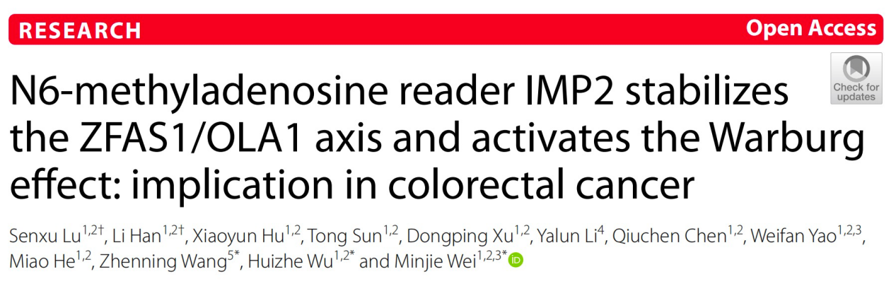 中文名稱(chēng):N6-甲基腺苷(m6A)閱讀蛋白IMP2能穩定ZFAS1/OLA1軸并激活沃伯格效應:在結直腸癌中的意義