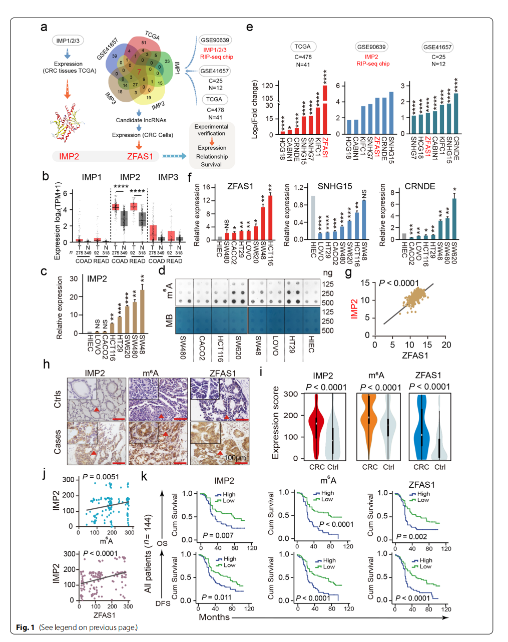 然后分析了m6A閱讀蛋白IMP1/2/3的RNA免疫沉淀測序(RIP-seq)數據以及TCGA中的數據,獲得了7個(gè)候選的lncRNA。其中ZFAS1、SNHG15和CRNDE表現出明顯的高表達(圖1e)。在CRC細胞中,ZFAS1表現出最明顯的高表達(圖1f)。在IMP1/2/3和ZFAS1之間計算相關(guān)性,發(fā)現ZFAS1和IMP2之間存在明顯的正相關(guān)(圖1g)。