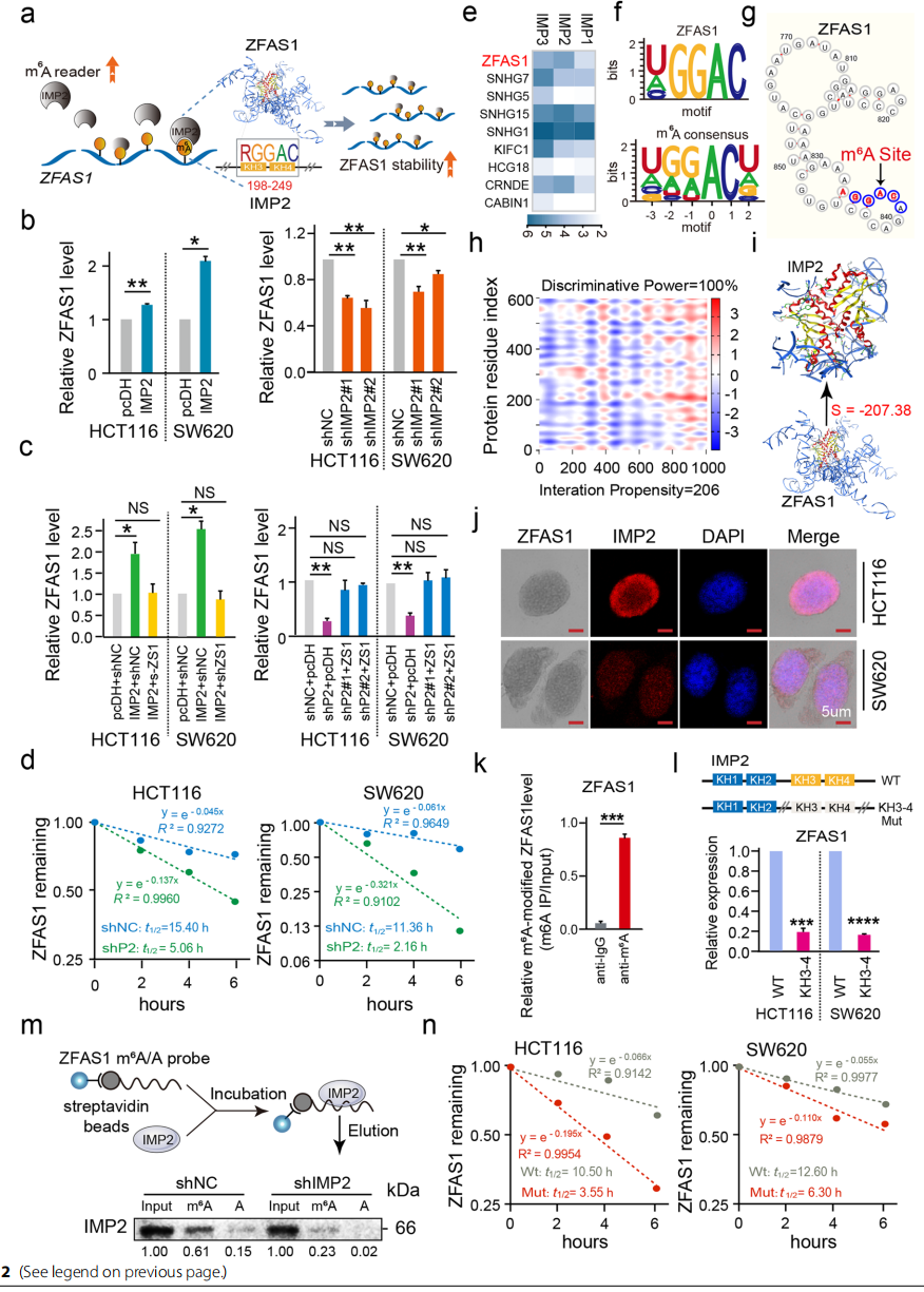 為了驗證IMP2和ZFAS1之間的直接關(guān)聯(lián),初步分析了FLAG標記的IMP1/2/3的RIP-seq數據,發(fā)現和對照相比,異位IMP2的表達極大地豐富了HEK293T細胞的內源性ZFAS1(圖2e)。此外,RNA結合蛋白的數據說(shuō)明IMP2蛋白有一個(gè)特定的結合域可以識別ZFAS1中的m6A motif(圖2f)。為了進(jìn)一步驗證IMP2和ZFAS1結合位點(diǎn)的可靠性,進(jìn)行了共定位的ISH和免疫熒光(IF)檢測,結果發(fā)現ZFAS1和IMP2的表達分布相一致,主要結合位點(diǎn)在HCT116和SW620的細胞質(zhì)中,部分在細胞核中(圖2j)。RIP分析發(fā)現相比對照組,用m6A抗體富集得到了更高表達的ZFAS1(圖2k),RNA下拉實(shí)驗說(shuō)明了通過(guò)攜帶m6A motif與IMP2蛋白特定結構域可以直接結合(圖2m)。利用qPCR驗證IMP2 KH3-4的WT和Mut載體處理后的HEK293T細胞中ZFAS1的表達,發(fā)現表達量顯著(zhù)減少(圖2i),說(shuō)明IMP2 KH3-4結構域可以與ZFAS1直接相互作用。
