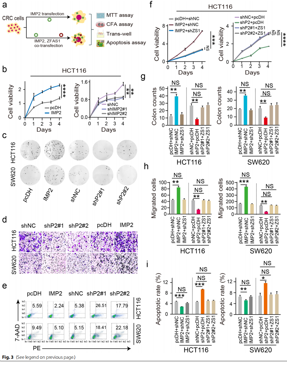 為了進(jìn)一步明確在CRC細胞中IMP2和ZFAS1特異性的調控模式,首先通過(guò)MTT實(shí)驗(圖3b)和細胞克隆實(shí)驗(CFA)(圖3c)分析了干擾IMP2表達后的HCT116和SW620細胞系的細胞增殖能力和細胞克隆能力。結果發(fā)現異位IMP2的表達顯著(zhù)促進(jìn)了CRC細胞的生長(cháng)和克隆能力,而IMP2的耗竭抑制了CRC細胞的增殖。此外還檢測了細胞侵襲能力(圖3d),發(fā)現在沉默IMP2時(shí),細胞的遷移受到了明顯的抑制,而IMP2的過(guò)表達極大地提高了HCT116和SW620細胞系的侵襲能力。還發(fā)現IMP2的敲除增加了CRC細胞的凋亡率,IMP2的過(guò)表達會(huì )抑制CRC細胞的凋亡率(圖3e)。后續通過(guò)拯救實(shí)驗表明ZFAS1的過(guò)表達逆轉了對CRC細胞的促進(jìn)作用,包括細胞增殖能力、細胞克隆能力、細胞遷移能力和細胞凋亡率(圖3f-i)。