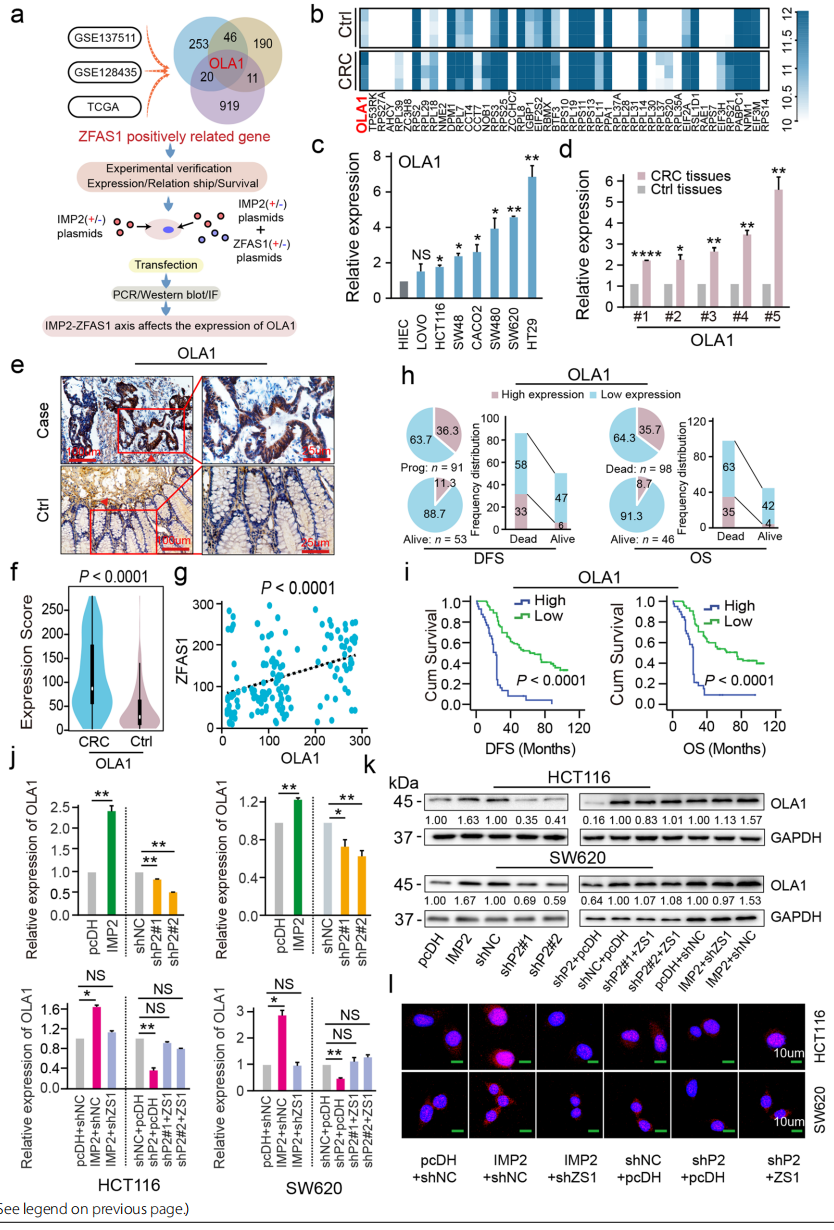 隨后采用TMA和IHC檢測OLA1的表達(圖4e),通過(guò)RCO曲線(xiàn)評估OLA1的低/高表達,發(fā)現與對照組相比,CRC組織中觀(guān)察到明顯的OLA1表達,表現出致癌基因的特性(圖4e,f)。且OLA1與ZFAS1的表達存在正相關(guān)性(圖4g)。與臨床數據做相關(guān)性分析,結果表明OLA1低表達的患者占比較高(圖4h),OLA1高表達的CRC患者的DFS和OS時(shí)間明顯縮短了(圖4i)。后續針對OLA1是否是ZFAS1的下游靶點(diǎn)做驗證,IMP2沉默/過(guò)表達不僅降低/增加了OLA1 mRNA的表達,而且降低/增加了OLA1蛋白的表達。但是IMP2對OLA1的影響可以被ZFAS2完全逆轉(圖4j-l)。