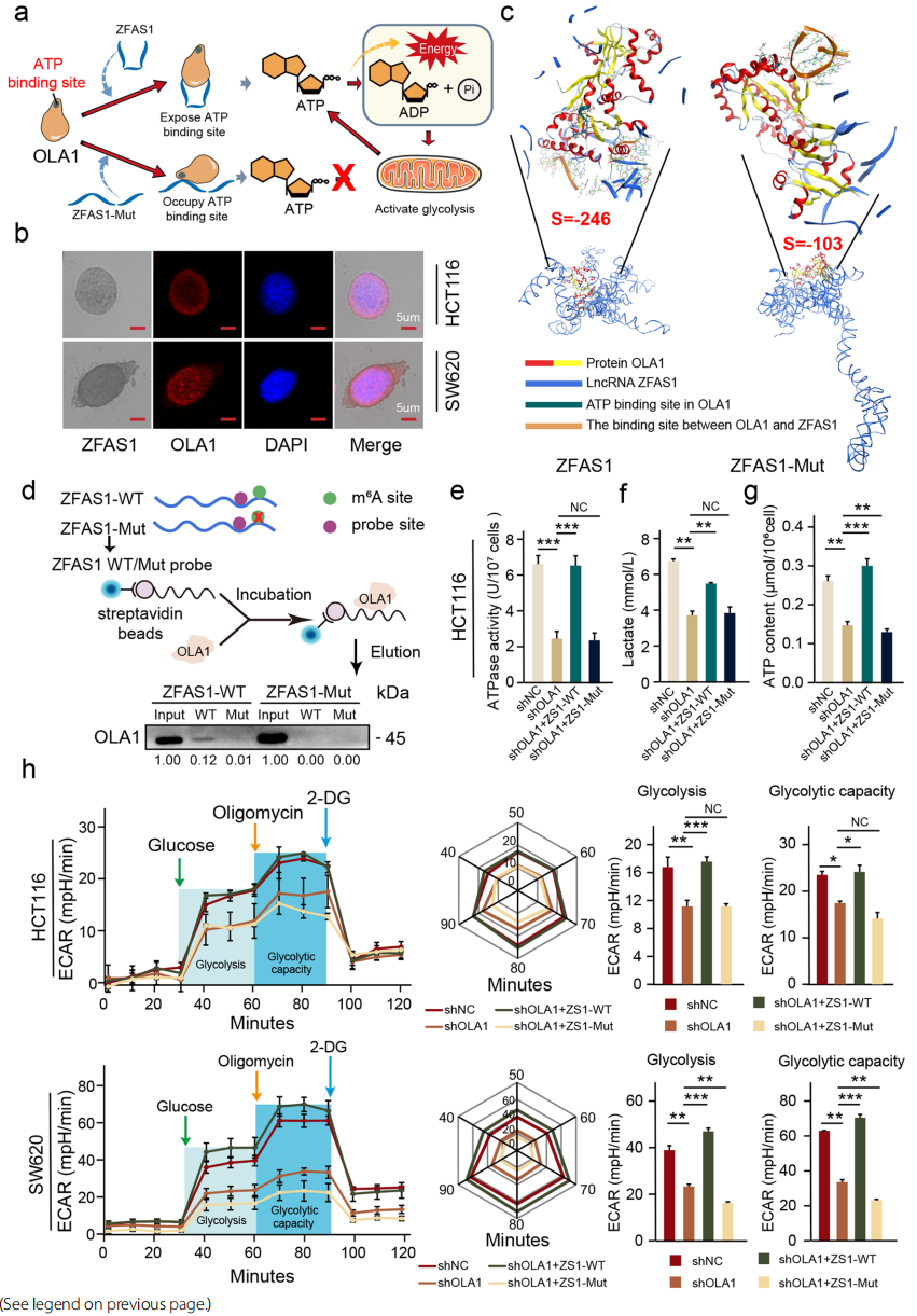 接下來(lái)探索OLA1的ATP酶活性的變化對CRC細胞能量代謝的影響,研究了HCT116和SW620細胞系中乳酸和ATP的含量。發(fā)現OLA1表達的減少不僅可以降低乳酸的積累,還可以減少細胞中ATP的含量(圖5f,g)。通過(guò)細胞外酸化率的測定檢測OLA1的變化對CRC細胞的糖酵解代謝能力的影響,發(fā)現OLA1表達的減少可以顯著(zhù)降低CRC細胞的糖酵解代謝能力,ZFAS1-WT可以恢復OLA1表達減少對CRC細胞糖酵解代謝能力的影響(圖5h)。
