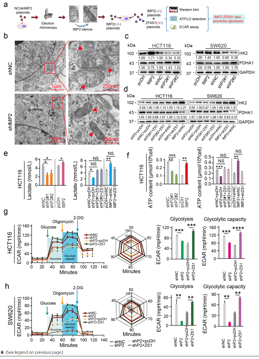通過(guò)電子顯微鏡觀(guān)察到IMP2沉默后線(xiàn)粒體形態(tài)發(fā)生變化,即發(fā)現CRC細胞中線(xiàn)粒體明顯腫脹和受損,IMP2沉默后線(xiàn)粒體的形態(tài)回復正常(圖6b)。同時(shí)IMP2的過(guò)度表達促進(jìn)了HK2(糖酵解的關(guān)鍵蛋白)的表達,抑制了PDHA1(氧化磷酸化的關(guān)鍵蛋白)的表達(圖6c)。然而ZFAS1沉默/過(guò)度表達和IMP2過(guò)表達/沉默后,HK2和PDHA1的表達水平得到恢復(圖6d)。