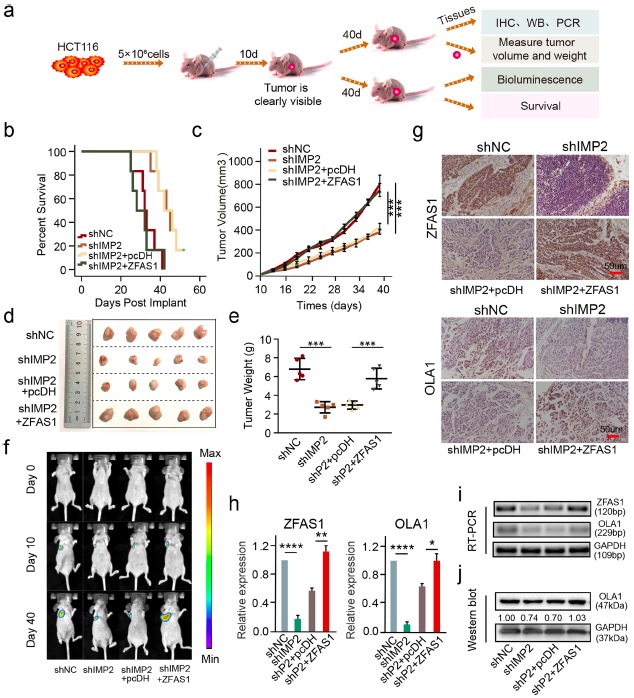 利用異體移植模型驗證IMP2-ZFAS1-OLA1信號軸在體內的生物學(xué)功能(圖7a),預后評估顯示異種移植小鼠在與shIMP2和ZFAS1載體共同轉染后,生存時(shí)間明顯縮短(圖7b),表明IMP2和ZFAS1在CRC預后評估中具有協(xié)同作用。此外,轉染shIMP2載體的異種移植小鼠中,腫瘤體積、大小和重量都明顯減少;然而,在與shIMP2和ZFAS1載體共同轉染后,腫瘤體積、大小和重量急劇增加(圖7c-e)。實(shí)驗結果說(shuō)明在異種移植模型中,ZFAS1的過(guò)表達明顯地逆轉了IMP2沉默對腫瘤生長(cháng)的抑制作用(圖7f)。