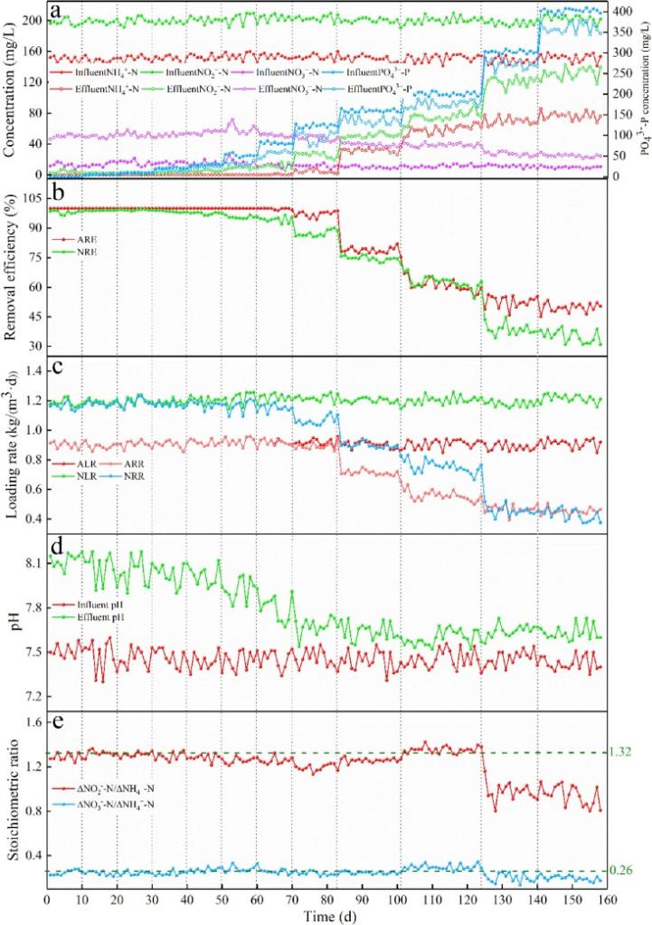 圖2. 不同磷酸鹽劑量下MAB在158 d內的脫氮性能:(a)底物濃度;(b)去除效率;(c)裝載率;(d) pH值變化;(e)化學(xué)計量比
