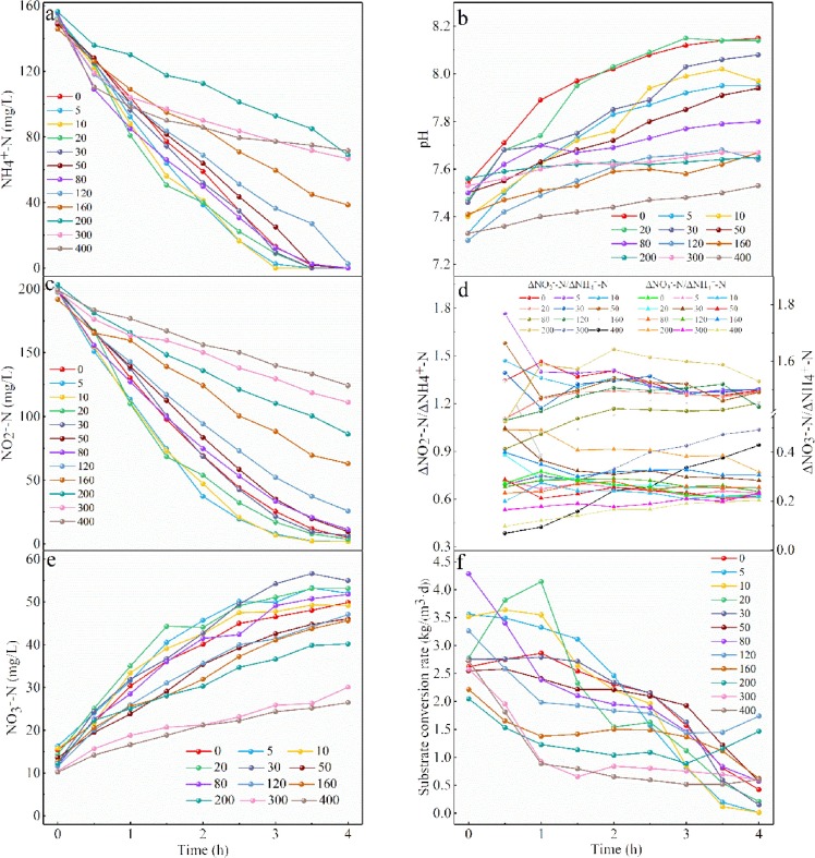 如圖3d所示,ΔNO2–N/ΔNH4+-N 和ΔNO3–N/ΔNH4+-N在前2小時(shí)出現不規則波動(dòng),然后趨于穩定。然而,在300-400 mg/L時(shí),ΔNO2–N/ΔNH4+-N顯著(zhù)偏離1.32,這與0-50 mg/L時(shí)的情況相反。隨著(zhù)磷酸鹽濃度的增加,出水pH升高的幅度逐漸變平(圖3b),例如400 mg/L時(shí),ΔpH值僅占不添加磷酸鹽時(shí)的33%。如圖3f所示,隨著(zhù)反應時(shí)間的延長(cháng),底物轉化率逐漸降低,在160-400 mg/L階段,由于磷酸鹽沉積物的存在,底物與生物質(zhì)之間的接觸受到阻礙,導致底物轉化率較低。因此,在高濃度磷酸鹽的存在下,SBR 中MAB的活性會(huì )嚴重惡化。