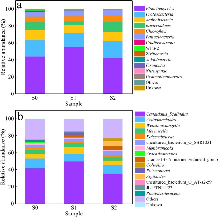 通過(guò)16S rRNA研究了不同磷酸鹽濃度下SBR中微生物群落的變化。三個(gè)時(shí)間的微生物樣品的OTU數量分別為311、300和297,圖4a揭示了SBR中的主要微生物:Planctomycetes、Proteobacteria、Actinobacteria、Bacteroidetes和Chloroflexi。其中,含有厭氧氨氧化菌屬的Planctomycetes仍處于優(yōu)勢地位,添加磷酸鹽后,S1中的Planctomycetes從初始的44.11%加至55.6%,然后在S2中下降至42.61%,屬水平上同樣。此外,Proteobacteria、Actinobacteria、Bacteroidetes和Chloroflexi的豐富度均由S0的19.36%、11.95%、9.3%和6.53%下降到S1的16.09%、9.31%、4.38%和6.37%,然后上升到S2的19.53%、11.18%、11.59% 和 7.68%。這表明上述4個(gè)門(mén)與Planctomycetes存在競爭關(guān)系,且Planctomycetes是含鹽廢水中的優(yōu)勢菌種。