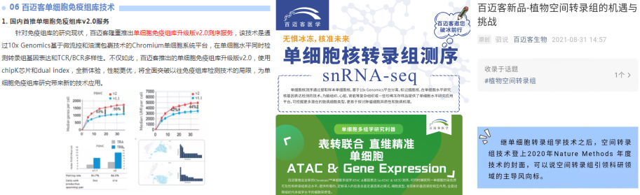百邁客是國內首批引進(jìn)10x genomics單細胞測序平臺,在國內展開(kāi)高通量單細胞測序服務(wù)。目前累計成功制備200余種組織類(lèi)型、5000+例的樣本,覆蓋的物種和樣品類(lèi)型包括人和小鼠的腦組織、肺臟、皮膚、視網(wǎng)膜、腎臟、脾臟、小腸,以及斑馬魚(yú)、擬南芥、水稻等。為了幫助更多老師開(kāi)展單細胞空間多組學(xué)研究領(lǐng)域,資深單細胞技術(shù)團隊在百邁客醫學(xué)微信公眾號創(chuàng )辦了百邁客單細胞 & 空間轉錄組專(zhuān)題欄目系列,可提供專(zhuān)業(yè)的課題方案設計、案例分享、數據分析和時(shí)空多維解決方案,同時(shí)含有發(fā)文思路、分析技巧、項目經(jīng)驗等應有盡有,百邁客人在過(guò)去的一年只為給您專(zhuān)業(yè)優(yōu)質(zhì)的單細胞&空間轉錄組系列服務(wù)!