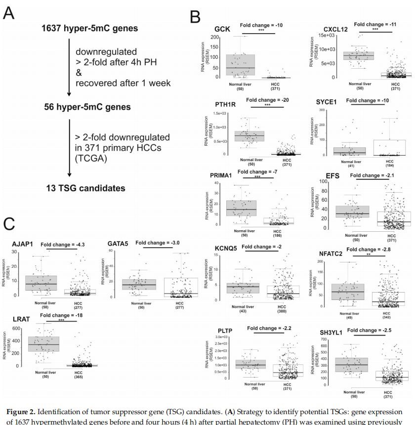 據報道,失調的DNA甲基化是HCC發(fā)病機制中的早期事件之一。此外,近期有研究數據表明多個(gè)腫瘤抑制基因如CDKN2A、HNF4A和TTP,通過(guò)啟動(dòng)子甲基化的發(fā)生在HCC細胞和再生的肝細胞增殖中起關(guān)鍵作用的,提示啟動(dòng)子甲基化讓TSG表達失調可能是HCC形成的一個(gè)重要因素。因此,新型TSG的鑒定將為闡述HCC形成的分子機制提供線(xiàn)索。