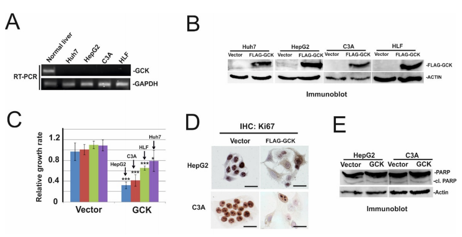 由于葡萄糖代謝的重編程是 HCC 的標志之一,進(jìn)一步關(guān)注表征一種TSG 候選物 – 葡萄糖激酶 (GCK) 的抗增殖作用。為了檢驗GCK是否可能在HCC 細胞中發(fā)揮抑癌基因的作用,首先分析了GCK在正常人肝臟和四種HCC細胞系中的表達,即Huh7、HepG2、C3A 細胞和 HLF 細胞(圖3A)。發(fā)現GCK在正常肝臟中高表達,在Huh7、HepG2、C3A細胞和HLF細胞中未檢測到有表達。然后在這些細胞系中過(guò)表達帶有FLAG 標記的GCK(圖3B) ,并使用結晶紫實(shí)驗檢查細胞生長(cháng)。GCK 的過(guò)表達強烈抑制 HepG2 和 C3A 細胞的生長(cháng),而在 HLF 和 Huh7 細胞中生長(cháng)抑制的效果不太明顯,但仍很顯著(zhù)(圖3C)。利用增殖標記物Ki67進(jìn)行的免疫組化染色證實(shí)了過(guò)表達GCK的HepG2和C3A細胞生長(cháng)受到抑制(圖3D)。為了檢查GCK過(guò)表達后HepG2和C3A細胞的減少,是否是因為增殖受到抑制和受到凋亡誘導,對凋亡標記物PARP進(jìn)行了免疫印跡雜交實(shí)驗。如圖3E所示,在GCK過(guò)表達的細胞中PARP沒(méi)有增加。這些數據表明GCK的過(guò)表達抑制細胞增殖但不誘導細胞凋亡。