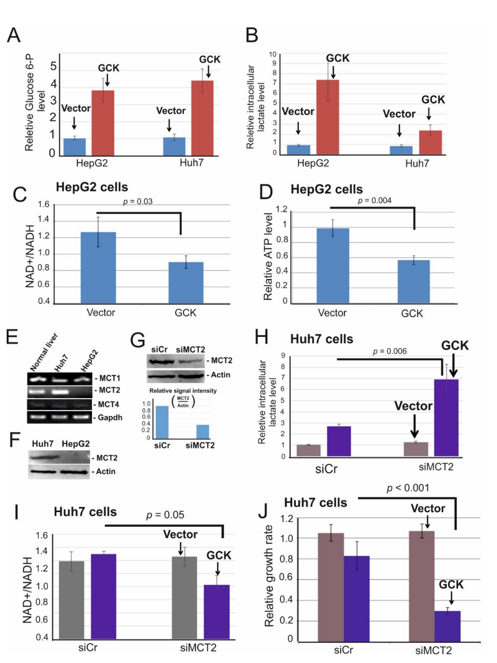由于GCK過(guò)表達并未強烈誘導Huh7細胞中的乳酸積累,這就提出了乳酸是如何在這些細胞中外排的問(wèn)題。乳酸外排由雙向單羧酸轉運體(MCTs)介導,已知有四種MCT可轉運乳酸,因此檢測了在 Huh7 和 HepG2 細胞中MCT變異體的表達。有趣的是,HepG2細胞僅表達MCT1和MCT4,而Huh7 細胞表達了三種變異體(圖4E)。還通過(guò)免疫印跡雜交實(shí)驗證實(shí)了HepG2 細胞中缺乏 MCT2的表達(圖4F)。這些數據提出了隨后的問(wèn)題,即細胞內乳酸積累是否由于HepG2細胞中缺乏MCT2所致。為了檢驗這種可能性,耗盡了GCK過(guò)表達的Huh7細胞中的MCT2(圖4G) 并檢測了細胞內乳酸的濃度。事實(shí)上,MCT2 的消耗顯著(zhù)誘導了乳酸的積累(圖4H)。因此,在MCT2耗盡的細胞中,NAD+/NADH 比率顯著(zhù)下降(圖4I) 并伴隨細胞增殖的減少(圖4J)??傊?,這些數據表明MCT2的缺乏在GCK過(guò)表達的細胞中顯著(zhù)積累了乳酸。