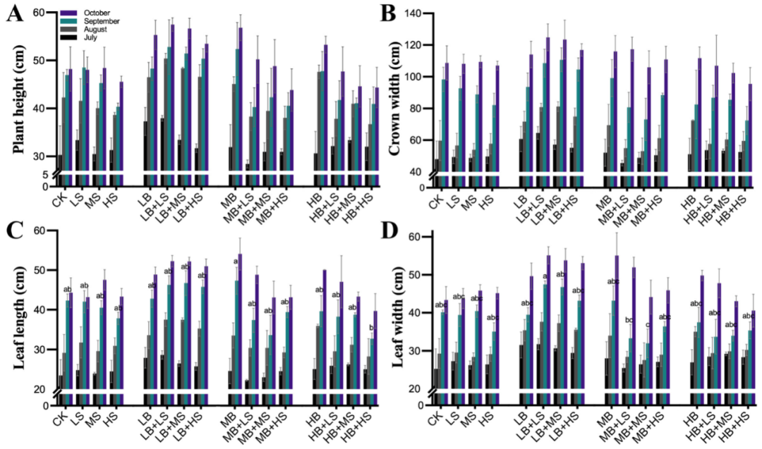 R. palmatum?L.在不同生長(cháng)時(shí)期(7、8、9、10月)的生長(cháng)參數如圖1所示。與對照組(CK)相比,任意三種濃度的細菌接種劑(LB、MB和HB)處理后的株高、冠寬、葉長(cháng)和葉寬都有所增加。我們的結果顯示了兩個(gè)明顯的倒V形趨勢,在四種含 LB 的處理(LB、LB + LS、LB + MS和LB + HS)中出現了一個(gè)外峰。盡管HB處理增加了R. palmatum?L.的生長(cháng),但當與蔗糖結合時(shí),它降低了生長(cháng),尤其是在 HB + HS 處理下。這表明用高水平蔗糖(15 g/L)修正的高水平細菌接種劑(1.0 ×?107CFU/mL)抑制了PGPM的植物促生長(cháng)功能。