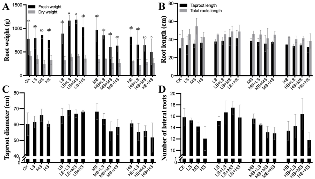 在收獲時(shí),還確定了地塊產(chǎn)量的變化(圖2)。與兩個(gè)明顯的倒V形趨勢的生長(cháng)結果一致,LB + LS和LB + MS處理下的R. palmatum?L.根的鮮重得到了最顯著(zhù)的改善(圖2A)。我們進(jìn)一步分析了主根和側根的變化(圖2B-D),發(fā)現在LB+MS下獲得最大的根長(cháng)和側根數,而在LB+LS下獲得最大的主根直徑,這意味著(zhù) LB + MS處理刺激側根的數量和長(cháng)度,而LB + LS促進(jìn)主根厚度以提高R. palmatum?L.的根重。