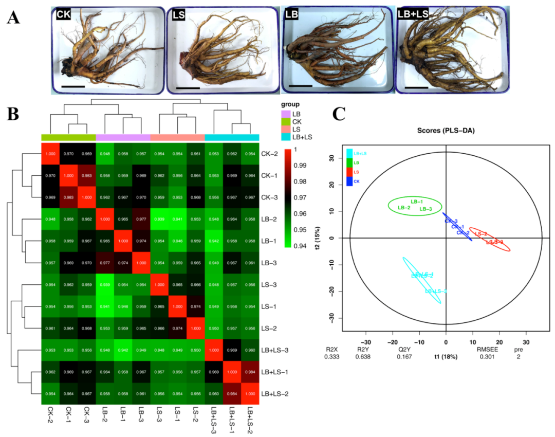 重點(diǎn)放在LB+LS的結合分組,通過(guò)廣靶代謝組學(xué)探索促進(jìn)植物生長(cháng)的潛在機制(圖3A)。共對12個(gè)新鮮的根樣品進(jìn)行了表征,鑒定了800種帶注釋的代謝物,主要由38種羧酸及其衍生物、15種有機氧化合物、14種脂肪?;?11種有機氮化合物組成。使用 GC-TOF-MS的全局靶向代謝組分析方法進(jìn)行相關(guān)偏最小二乘判別分析 (PLS-DA),如圖所示(圖3B),三個(gè)生物配對之間的 Spearman相關(guān)系數均超過(guò)0.94,這表現了實(shí)驗的高重現性。然后通過(guò)PLS-DA評分圖來(lái)評估這些植物組織樣品之間的差異(圖3C),結果顯示出了分組之間的明顯分離。此外,對潛在結構判別分析(OPLS-DA)建模的監督正交投影也揭示了這些分組植物組織樣本代謝組比較中的顯著(zhù)差異。