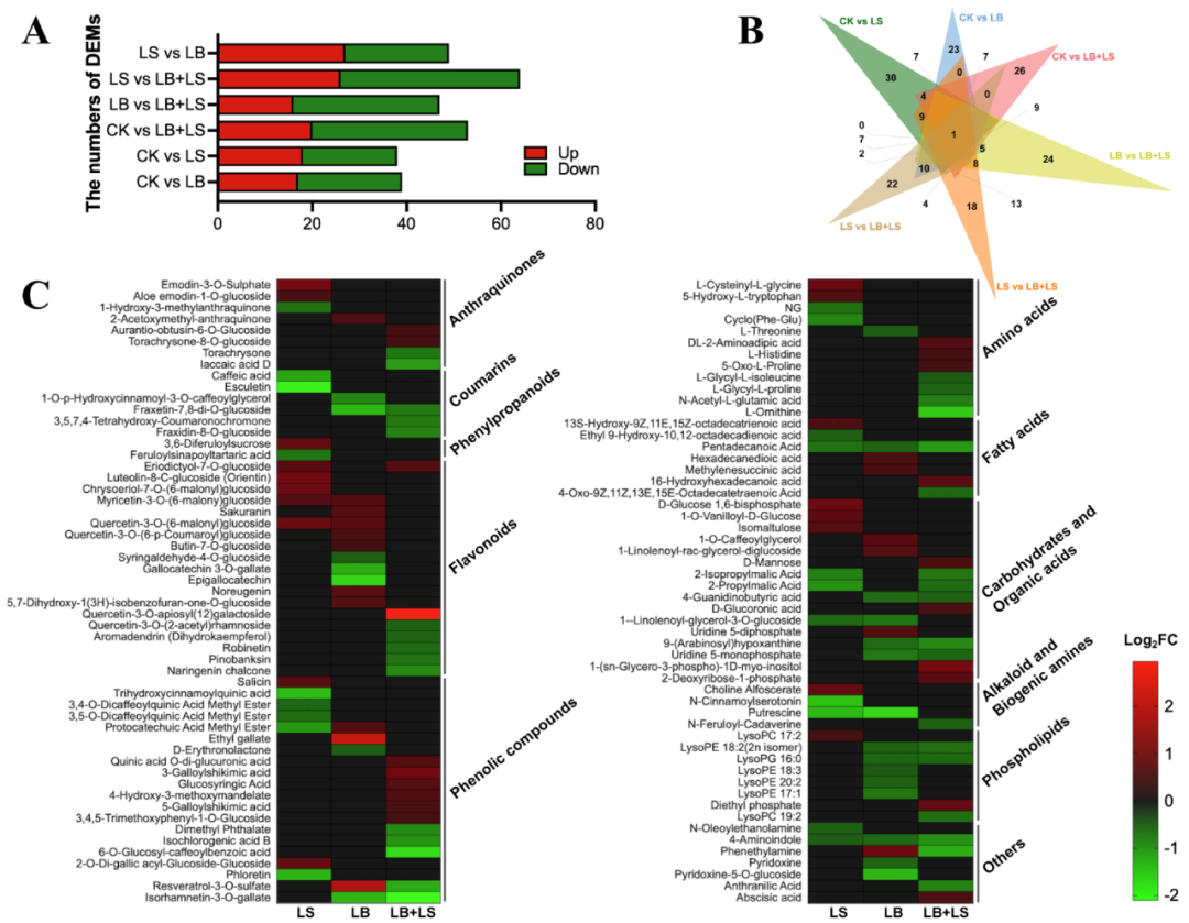 通過(guò)VIP(Variable Importance in Projection ) ≥ 1、倍數變化 ≥ 1.5 和 p 值 ≤ 0.05 的篩選標準,顯著(zhù)鑒定了 38、39、53、47、64 和 49 種差異表達代謝物 (DEMs,Differentially Expressed Metabolites )分別在 CK vs.LS、CK vs.LB、CK vs.LB + LS、LB vs.LB + LS、LS vs.LB + LS 和LS vs.LB(圖4A)。
